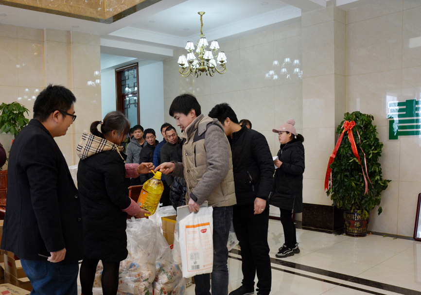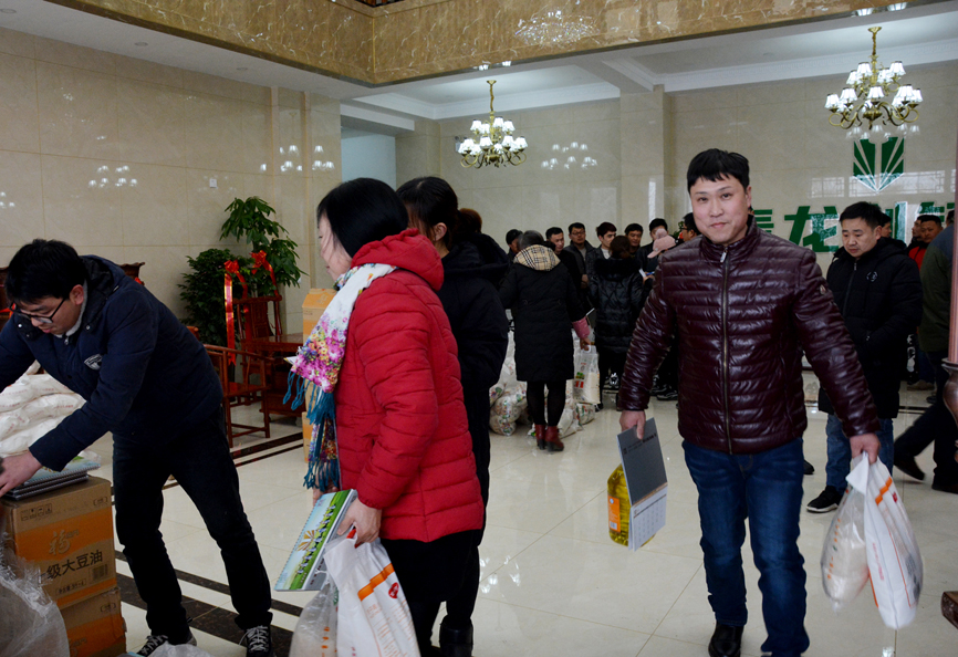 員工會議結束后,員工們領取公司為大家準備的福利。